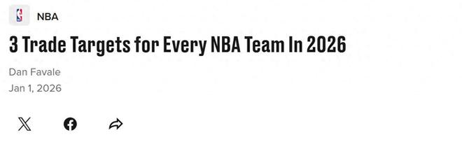 海量大魚!在26年到來之際,美媒《BR》結合各隊實際補強需求,曬出每支球隊在26年交易截止日前TOP3交易目標,其中湖人應追狄龍,勇士全力搶字母哥。