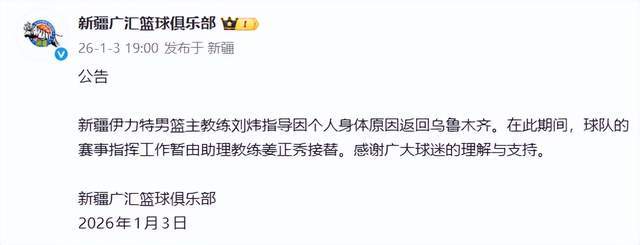 如今,第4位下課的主教練也誕生了,那就是新疆隊主帥劉煒。1月3日,新疆隊自己官宣了這一消息,劉煒因家庭原因返回烏魯木齊,而接下來將由韓國籍助教薑正秀來指揮。