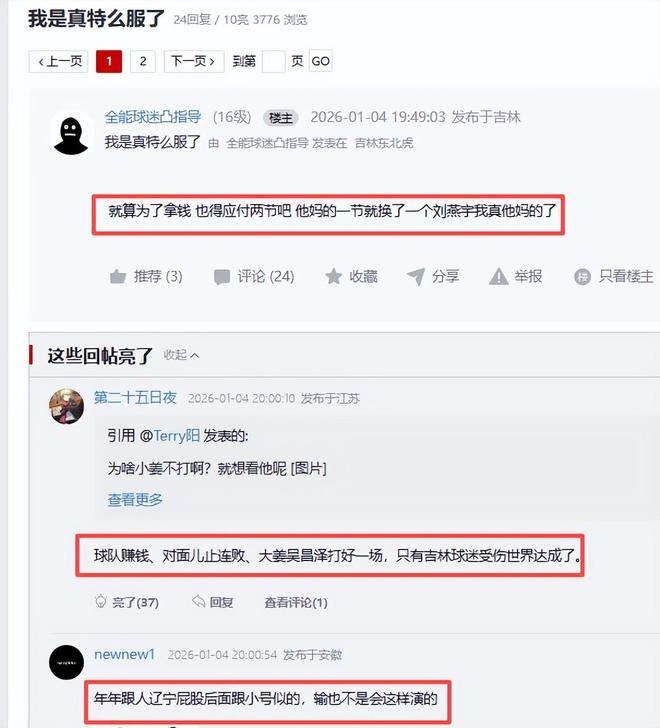 這場比賽在球迷看來,是一場默契球,吉林不但是有意放水,還被吉林球迷懷疑是輸球為了賺錢。他們說,“就算為了拿錢 也得應付兩節吧,他M的一節就換了一個劉燕宇我真他M的了"、”球隊賺錢、對麵兒止連敗、大薑吳昌澤打好一場,隻有吉林球迷受傷世界達成了。”