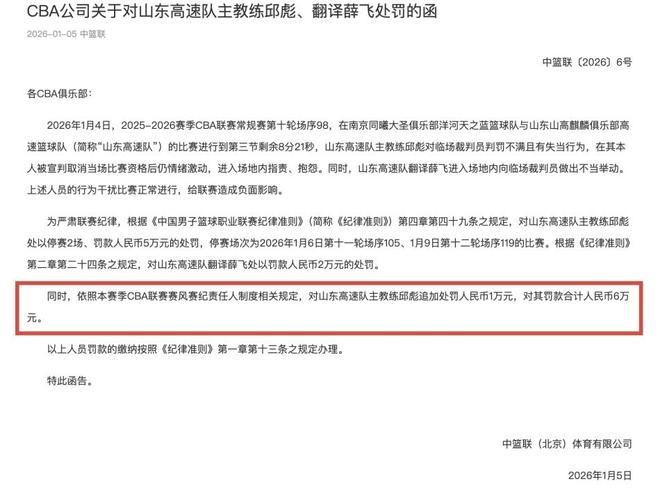 CBA官方正式發布通告:山東男籃主教練邱彪,由於在麵對南京同曦的比賽中,對臨場裁判員判罰不滿,且有失當的行為,並且在取消比賽資格後仍有情緒激動的舉動,根據紀律準則規定,決定處以停賽2場,外加罰款5萬的處罰。此外,根據聯賽賽風賽紀責任人的相關規定,對邱彪追加處罰1萬,合計罰款6萬人民幣。