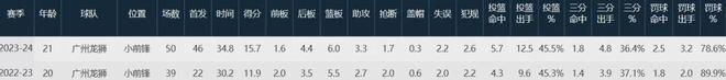 過去崔永熙為廣州隊出戰兩年時間裏,菜鳥賽季就能場均11.9分5.5板2.7助2斷,投籃命中率45.3%;二年級場均15.7分6板3.3助1.7斷,投籃命中率45.5%。