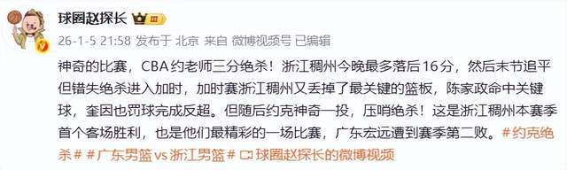 作為著名的體育媒體人,球圈趙探長老師就大呼神奇,“神奇的比賽,CBA約老師三分絕殺!浙江稠州今晚最多落後16分,然後末節追平但錯失絕殺進入加時,加時賽浙江稠州又丟掉了最關鍵的籃板,陳家政命中關鍵球,奎因也罰球完成反超。但隨後約克神奇一投,壓哨絕殺!這是浙江稠州本賽季首個客場勝利,也是他們最精彩的一場比賽,廣東宏遠遭到賽季第二敗。”