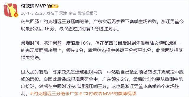 媒體人付政浩老師則認為,此役可謂“蕩氣回腸!約克超遠三分壓哨絕殺,廣東宏遠無奈吞下賽季主場首敗。浙江男籃今晚最多落後16分,最終通過加時賽1分險勝對手。”