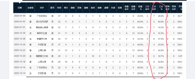 前六場比賽,他的三分命中率依次是33.3%,0%,50%,16.7%,42.9%,25%。