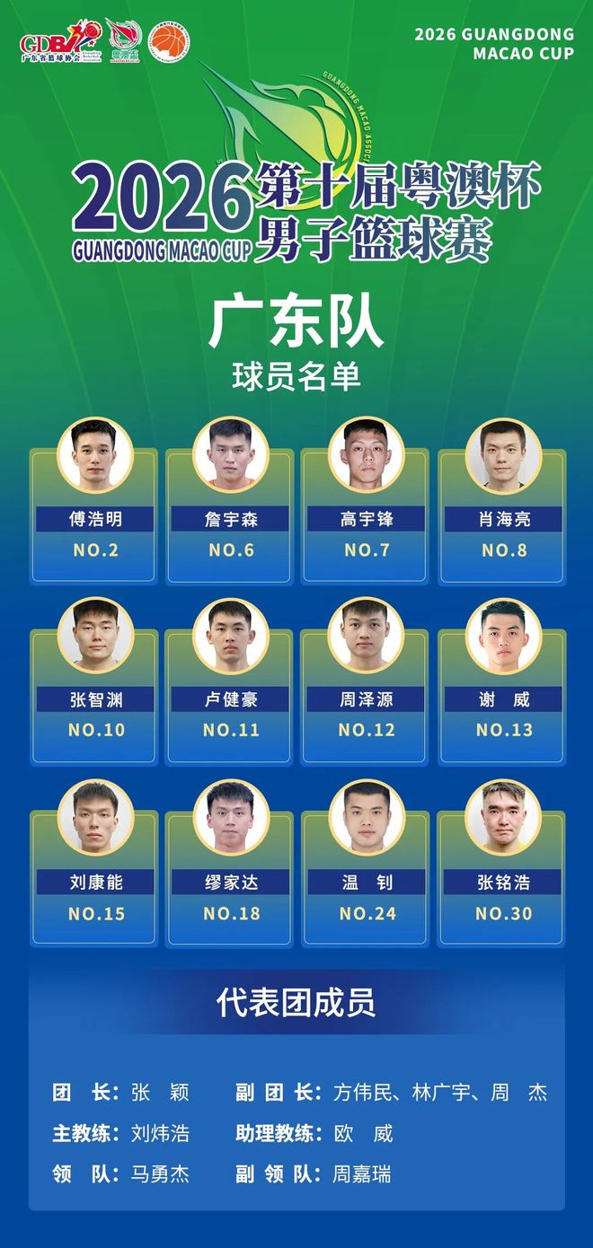 廣東隊以此前 第八屆粵港杯陣容為班底,由 劉煒浩指導掛帥, 增補了詹宇森、謝威和惠州本土球員溫釗三名球員。