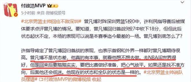 顯而易見,談到曾凡博時,許利民不是表揚他,而是批評他,那麽許利民前麵痛批的明星球員擺譜、耍大牌,應該指的就是曾凡博。當然記者沒有叫許利民談周琦的表現,不談周琦的表現,不等於不批評他。許利民的震怒,在我看來不隻是單單指向曾凡博,同時還包含了連續兩場表現拉胯的周琦。你們說呢?