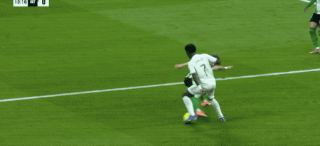 姆巴佩不在,維尼修斯更加積極主動要球,第7分鍾,維尼修斯突入禁區被疑似追尾倒地,裁判示意沒有點球。