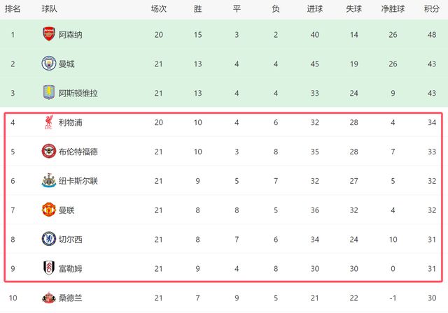 由於本輪切爾西在客場1-2輸給富勒姆,曼聯在積分榜上反超對手,但是他們的排名卻被紐卡斯爾和布倫特福德反超。其中布倫特福德主場3-0大勝桑德蘭,排名已經升上第5,落後第四的利物浦1分,他們已經成為名副其實的爭四大黑馬,而紐卡斯爾在主場4-3絕殺利茲聯之後,也反超曼聯和切爾西,目前排名第6。