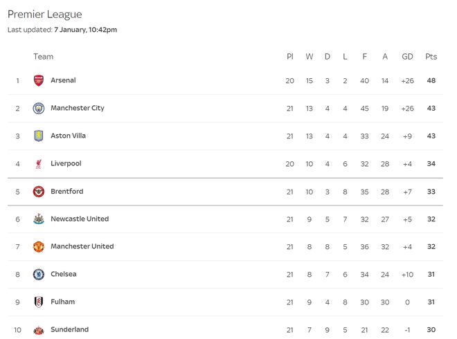 積分榜上,曼聯確實把握住切爾西輸球的機會超越了對手,可惜布倫特福德後來居上,占據了積分榜第五的位置,他們本輪3-0大勝桑德蘭。紐卡斯爾聯也依靠淨勝球反超紅魔,現在弗萊徹的球隊落到了第7名。