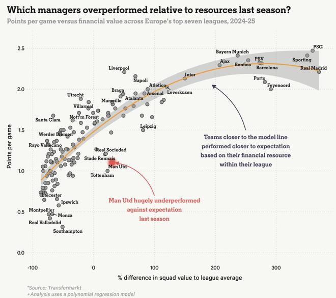 簡而言之,位於模型參考線之上的球隊,代表其主帥有效放大了陣容價值;而位於參考線之下的球隊——其中也包括曼聯——則體現出明顯的低於預期表現。