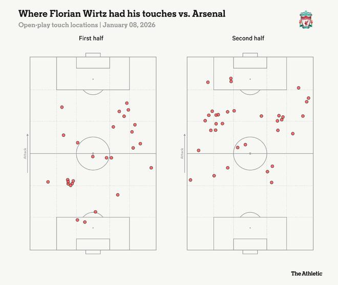 隨著阿森納早期掌控力的鬆動,利物浦逐漸進入比賽狀態,在下半場主導了球權。這部分源於阿森納似乎滿足於退守保住平局,同時維爾茨也發揮了更大影響力,他回撤更深並在球場遊弋,與索博斯洛伊完成流暢配合。在一次幹淨利落的盤帶後被特羅薩德阻擋身體,他甚至可能覺得自己未能贏得點球有些遺憾。