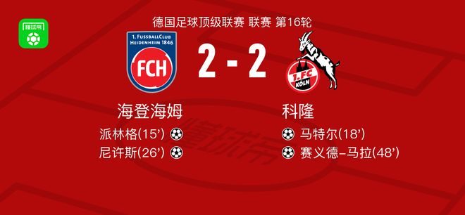 北京時間1月10日德國足球頂級聯賽 聯賽 第16輪,海登海姆主場對陣科隆。海登海姆派林格破門,尼許斯破門。科隆馬特爾破門,賽義德-馬拉破門。最終比分海登海姆 2-2 科隆。