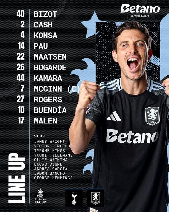 維拉首發:40-比佐、22-馬特森、2-卡什、4-孔薩、14-保-托雷斯、26-博加德、27-摩根-羅傑斯、44-卡馬拉、10-布恩迪亞、7-麥金、17-馬倫
