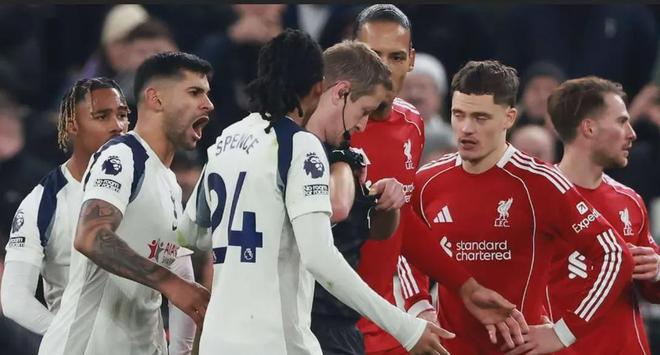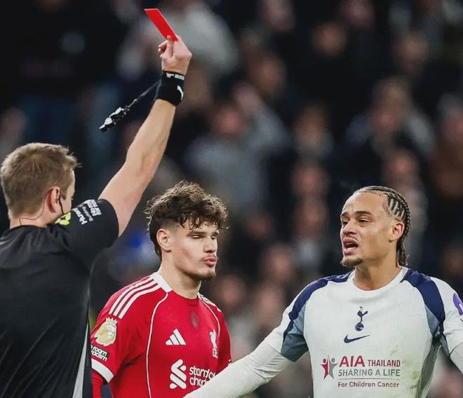 這場比賽的戲劇性,從第30分鍾就注定拉滿。熱刺10號哈維·西蒙斯在逼搶中蹬踏範戴克小腿,主裁判先出示黃牌,經VAR介入後改判直紅罰下。這本該是利物浦掌控全局的開始,卻沒想到成了“混亂模式”的啟動鍵。補時階段,羅梅羅拚搶後的附加動作吃到第二張黃牌,兩黃變一紅離場,熱刺就此淪為9人作戰。數據統計顯示,這是2007年10月以來,首支在對陣利物浦的英超比賽中吃到兩張紅牌的球隊,熱刺用最魯莽的方式,續寫了對紅軍的悲情曆史。